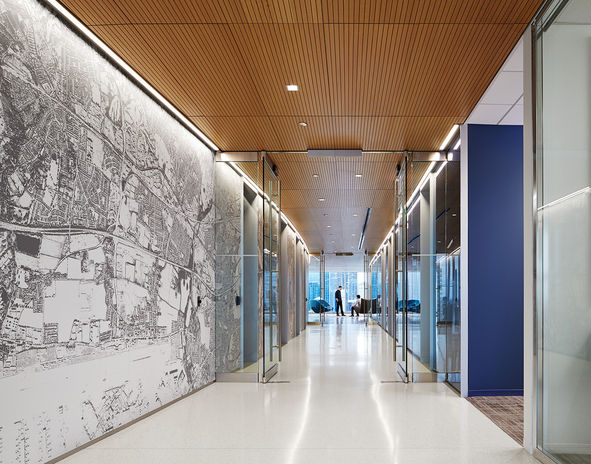 Sistema ranurado con velo acústico posterior y núcleo absorbente que mejora el confort sonoro.